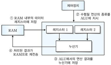 ②제어장치는 새롭게 저장된 레지스터 1번 데이터와 이전부터 저장하고 있던 레지스터 2번의 데이터를 덧셈하라는 제어신호를 ALU로 전달된다.