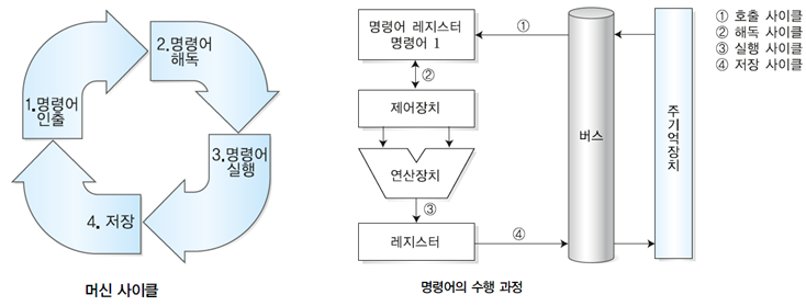 - 프로그램을 구성하는 명령어는 4단계의 과정을 통해서 수행. 그런데 이 과정은 CPU에서 동작을 하므로 머신 사이클이라고 한다.